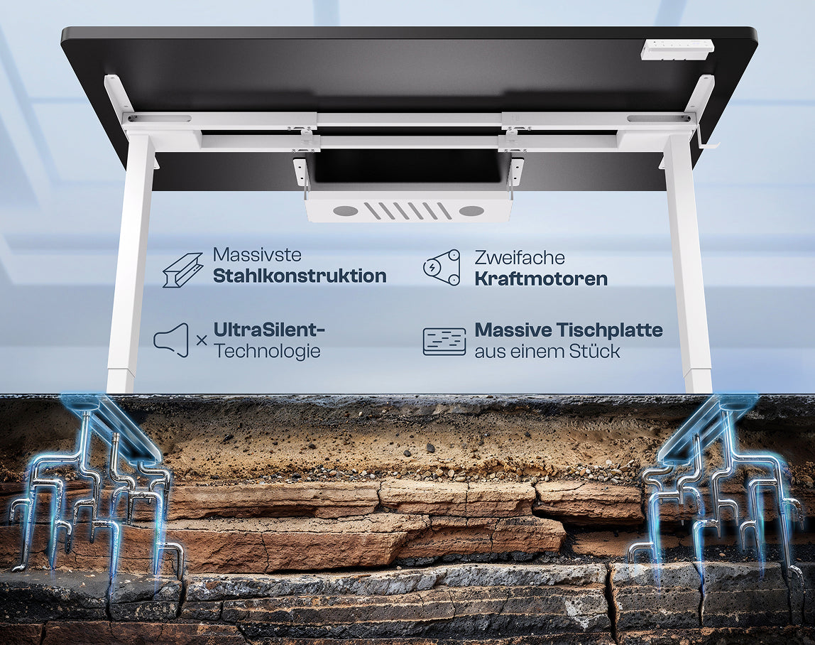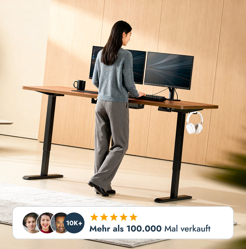 Because with the electric height adjustment, you can flexibly switch between sitting and standing at any time. This activates your muscles, relieves the spine, and improves blood circulation - for more focus, less back pain, and healthier working.