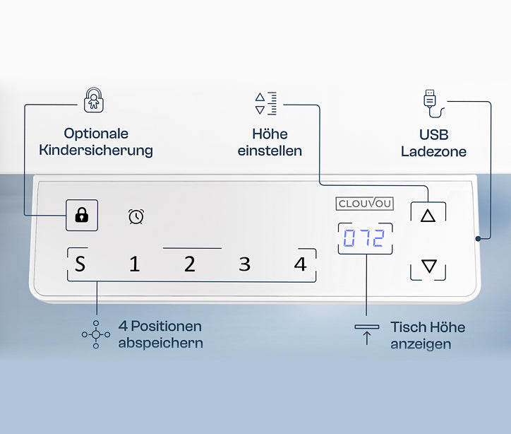 With the integrated memory function, you can save up to four individual heights - e.g., for focused typing, creative sessions while standing, or team calls at eye level. Once saved, always accessible - without endless readjusting.