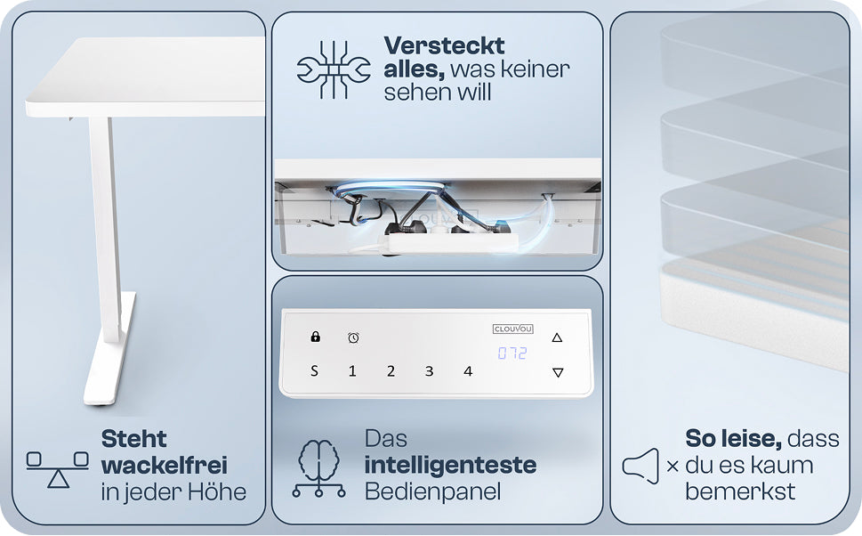 The CLOUVOU ProDesk can be continuously adjusted from 72 to 120 cm - very easily with the push of a button. This way, you can switch between sitting and standing at any time without interrupting your workflow. The result: more energy, better concentration, and a healthier back in the long term. Perfect for everyone who wants to work more flexibly in everyday life.